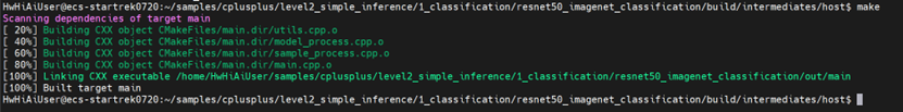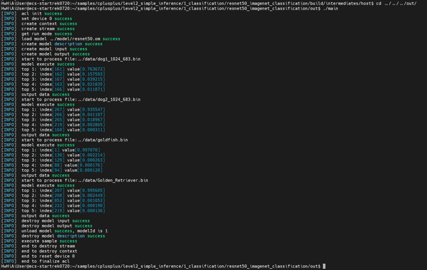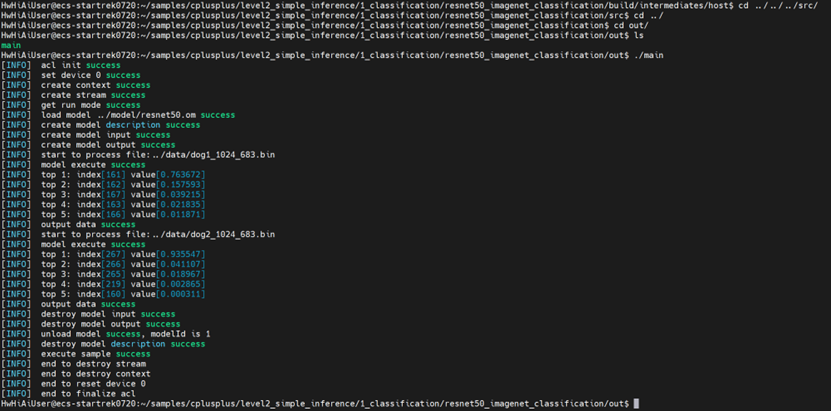 可以在样例目录(cplusplus/level2_simple_inference/1_classification/resnet50_imagenet_classification)下的out文件夹中找到编译好的可执行main文件,接下来我们直接运行main文件