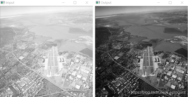 下图表示经过伽玛变换处理后的效果图,伽马变换对于图像对比度偏低,并且整体亮度值偏高(或由于相机过曝)情况下的图像增强效果明显。