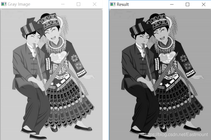 # -*- coding: utf-8 -*- import cv2 import numpy as np import matplotlib.pyplot as plt #读取原始图像 img = cv2.imread('miao.png') #图像灰度转换 grayImage = cv2.cvtColor(img, cv2.COLOR_BGR2GRAY) #获取图像高度和宽度 height = grayImage.shape[0] width = grayImage.shape[1] #创建一幅图像 result = np.zeros((height, width), np.uint8) #图像灰度非线性变换:DB=DA×DA/255 for i in range(height): for j in range(width): gray = int(grayImage[i,j])*int(grayImage[i,j]) / 255 result[i,j] = np.uint8(gray) #显示图像 cv2.imshow("Gray Image", grayImage) cv2.imshow("Result", result) #等待显示 cv2.waitKey(0) cv2.destroyAllWindows()