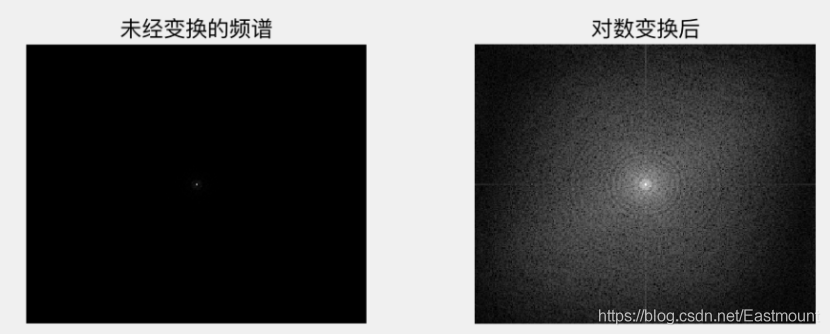 对数变换实现了扩展低灰度值而压缩高灰度值的效果,被广泛地应用于频谱图像的显示中。一个典型的应用是傅立叶频谱,其动态范围可能宽达0~106直接显示频谱时,图像显示设备的动态范围往往不能满足要求,从而丢失大量的暗部细节;而在使用对数变换之后,图像的动态范围被合理地非线性压缩,从而可以清晰地显示。在下图中,未经变换的频谱经过对数变换后,增加了低灰度区域的对比度,从而增强暗部的细节。