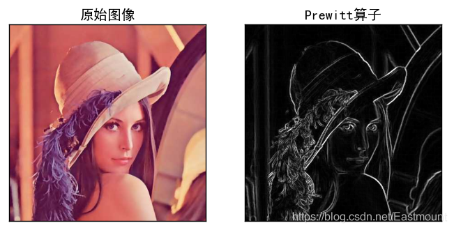# -*- coding: utf-8 -*- import cv2 import numpy as np import matplotlib.pyplot as plt #读取图像 img = cv2.imread('lena.png') lenna_img = cv2.cvtColor(img,cv2.COLOR_BGR2RGB) #灰度化处理图像 grayImage = cv2.cvtColor(img, cv2.COLOR_BGR2GRAY) #Prewitt算子 kernelx = np.array([[1,1,1],[0,0,0],[-1,-1,-1]],dtype=int) kernely = np.array([[-1,0,1],[-1,0,1],[-1,0,1]],dtype=int) x = cv2.filter2D(grayImage, cv2.CV_16S, kernelx) y = cv2.filter2D(grayImage, cv2.CV_16S, kernely) #转uint8 absX = cv2.convertScaleAbs(x) absY = cv2.convertScaleAbs(y) Prewitt = cv2.addWeighted(absX,0.5,absY,0.5,0) #用来正常显示中文标签 plt.rcParams['font.sans-serif']=['SimHei'] #显示图形 titles = [u'原始图像', u'Prewitt算子'] images = [lenna_img, Prewitt] for i in xrange(2): plt.subplot(1,2,i+1), plt.imshow(images[i], 'gray') plt.title(titles[i]) plt.xticks([]),plt.yticks([]) plt.show()