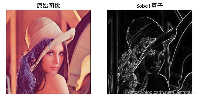 # -*- coding: utf-8 -*- import cv2 import numpy as np import matplotlib.pyplot as plt #读取图像 img = cv2.imread('lena.png') lenna_img = cv2.cvtColor(img,cv2.COLOR_BGR2RGB) #灰度化处理图像 grayImage = cv2.cvtColor(img, cv2.COLOR_BGR2GRAY) #Sobel算子 x = cv2.Sobel(grayImage, cv2.CV_16S, 1, 0) #对x求一阶导 y = cv2.Sobel(grayImage, cv2.CV_16S, 0, 1) #对y求一阶导 absX = cv2.convertScaleAbs(x) absY = cv2.convertScaleAbs(y) Sobel = cv2.addWeighted(absX, 0.5, absY, 0.5, 0) #用来正常显示中文标签 plt.rcParams['font.sans-serif']=['SimHei'] #显示图形 titles = [u'原始图像', u'Sobel算子'] images = [lenna_img, Sobel] for i in xrange(2): plt.subplot(1,2,i+1), plt.imshow(images[i], 'gray') plt.title(titles[i]) plt.xticks([]),plt.yticks([]) plt.show()