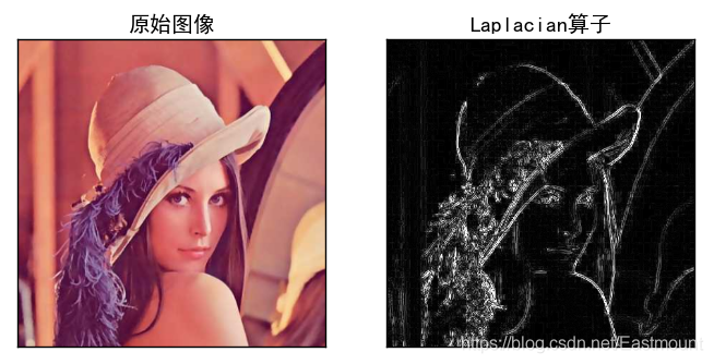 # -*- coding: utf-8 -*- import cv2 import numpy as np import matplotlib.pyplot as plt #读取图像 img = cv2.imread('lena.png') lenna_img = cv2.cvtColor(img,cv2.COLOR_BGR2RGB) #灰度化处理图像 grayImage = cv2.cvtColor(img, cv2.COLOR_BGR2GRAY) #拉普拉斯算法 dst = cv2.Laplacian(grayImage, cv2.CV_16S, ksize = 3) Laplacian = cv2.convertScaleAbs(dst) #用来正常显示中文标签 plt.rcParams['font.sans-serif']=['SimHei'] #显示图形 titles = [u'原始图像', u'Laplacian算子'] images = [lenna_img, Laplacian] for i in xrange(2): plt.subplot(1,2,i+1), plt.imshow(images[i], 'gray') plt.title(titles[i]) plt.xticks([]),plt.yticks([]) plt.show()