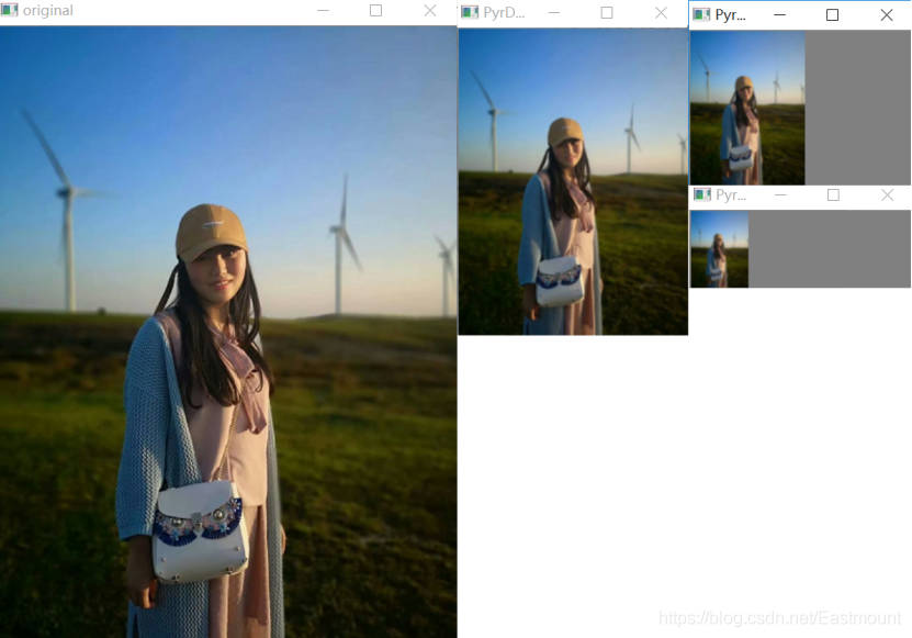 # -*- coding: utf-8 -*- import cv2 import numpy as np import matplotlib.pyplot as plt #读取原始图像 img = cv2.imread('nv.png') #图像向下取样 r1 = cv2.pyrDown(img) r2 = cv2.pyrDown(r1) r3 = cv2.pyrDown(r2) #显示图像 cv2.imshow('original', img) cv2.imshow('PyrDown1', r1) cv2.imshow('PyrDown2', r2) cv2.imshow('PyrDown3', r3) cv2.waitKey() cv2.destroyAllWindows()
