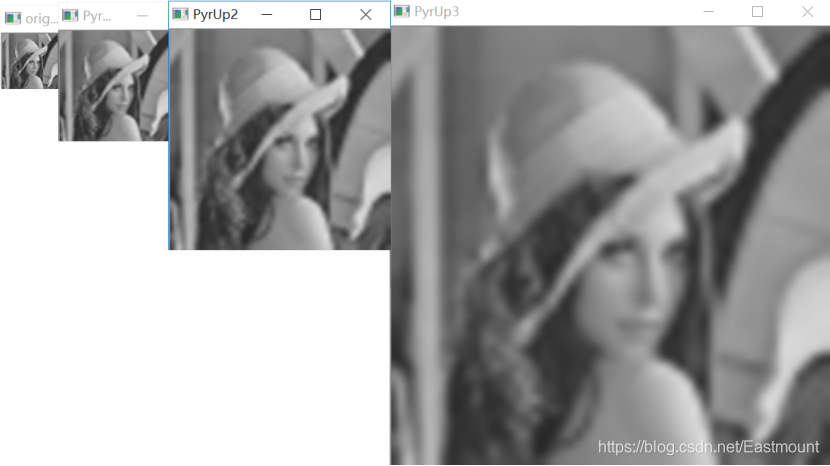 输出结果如图6-17所示,每次向上取样均为上次图像的四倍,但图像的清晰度会降低。