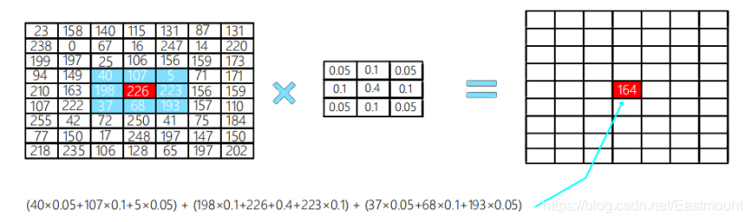 高斯核卷积让临近中心的像素点具有更高的重要度,对周围像素计算加权平均值,如图6-12所示,其中心位置权重最高为0.4。