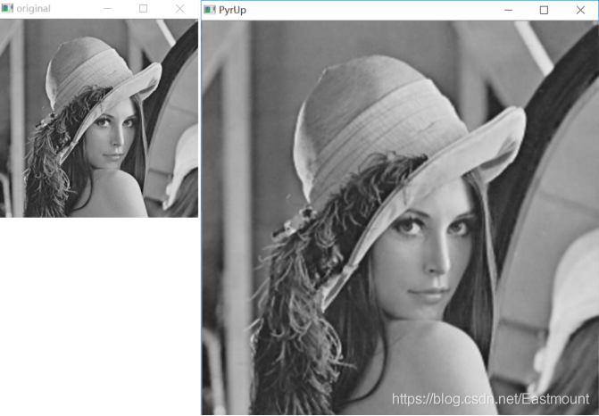 # -*- coding: utf-8 -*- import cv2 import numpy as np import matplotlib.pyplot as plt #读取原始图像 img = cv2.imread('lena.png') #图像向上取样 r = cv2.pyrUp(img) #显示图像 cv2.imshow('original', img) cv2.imshow('PyrUp', r) cv2.waitKey() cv2.destroyAllWindows()
