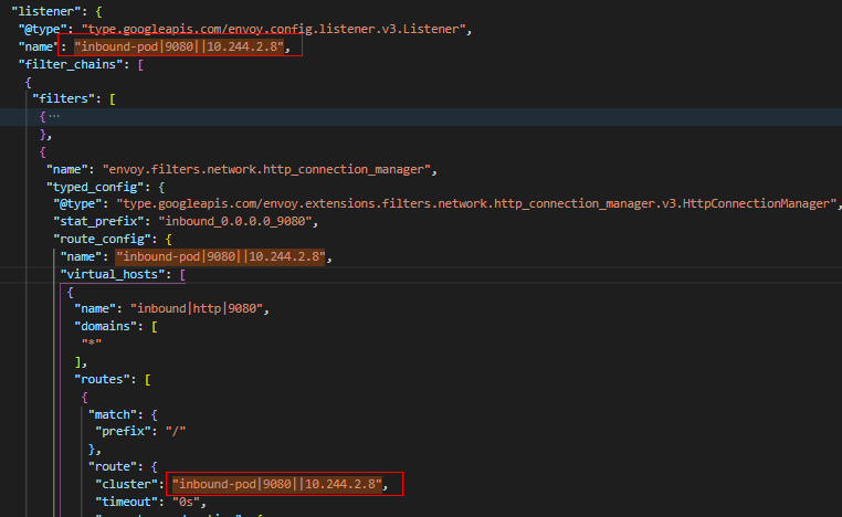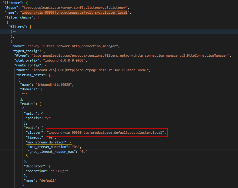 (3)Vip监听器非常重要,一些服务治理策略,比如VirtualService设置的路由策略都在此监听器中加载,这里我们没有配置任何的策略,因此它主要是通过"inbound-vip|9080|http|productpage.default.svc.cluster.local" Cluster进行负载均衡,将将流量转发到Pod监听器处理。