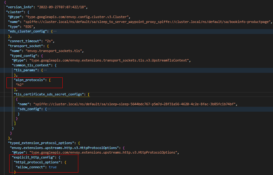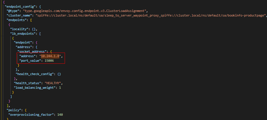 (4)"spiffe://cluster.local/ns/default/sa/sleep_to_server_waypoint_proxy_spiffe://cluster.local/ns/default/sa/bookinfo-productpage" Cluster为EDS类型,包含的Endpoint地址为10.244.1.8:15006,即waypoint容器的监听地址。后面我们可以看到waypoint中有监听器监听在15006端口。此Cluster负责将流量进行加密,然后发送到waypoint(10.244.1.8:15006)。