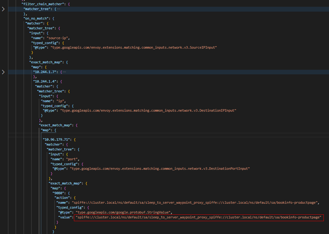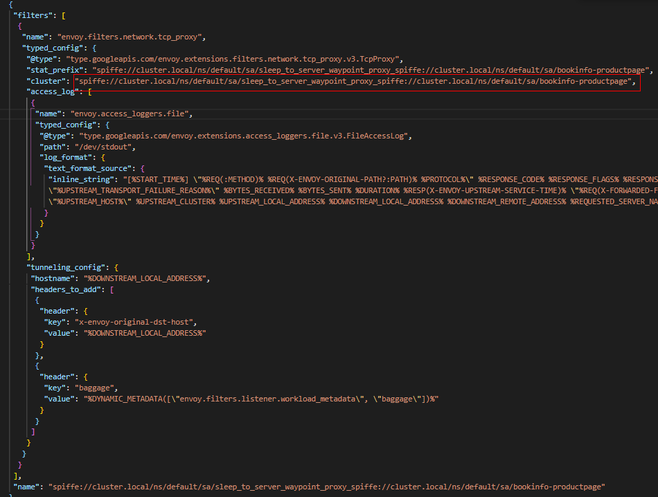 (3)"spiffe://cluster.local/ns/default/sa/sleep_to_server_waypoint_proxy_spiffe://cluster.local/ns/default/sa/bookinfo-productpage" FilterChain,包含一个TCPProxy过滤器,并且关联到与FilterChain同名的Cluster。即访问请求交由同名的 Cluster处理