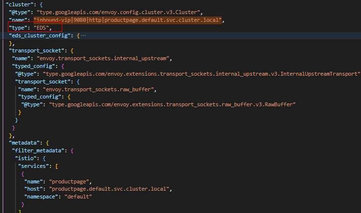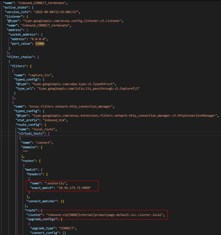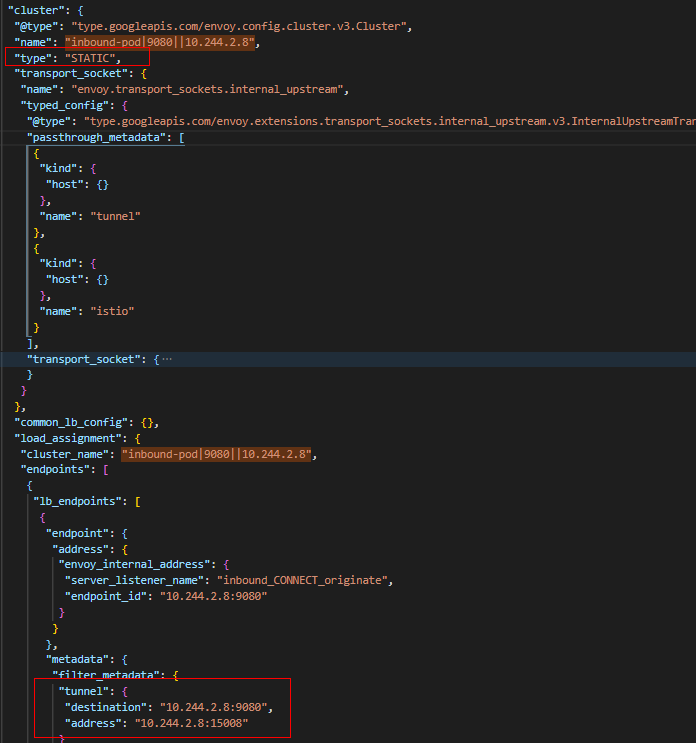 (5)"inbound-pod|9080||10.244.2.8" 是一个静态的Cluster,其主要设置建立CONNECT 相关的metadata,然后将流量转发给” inbound_CONNECT_originate”监听器