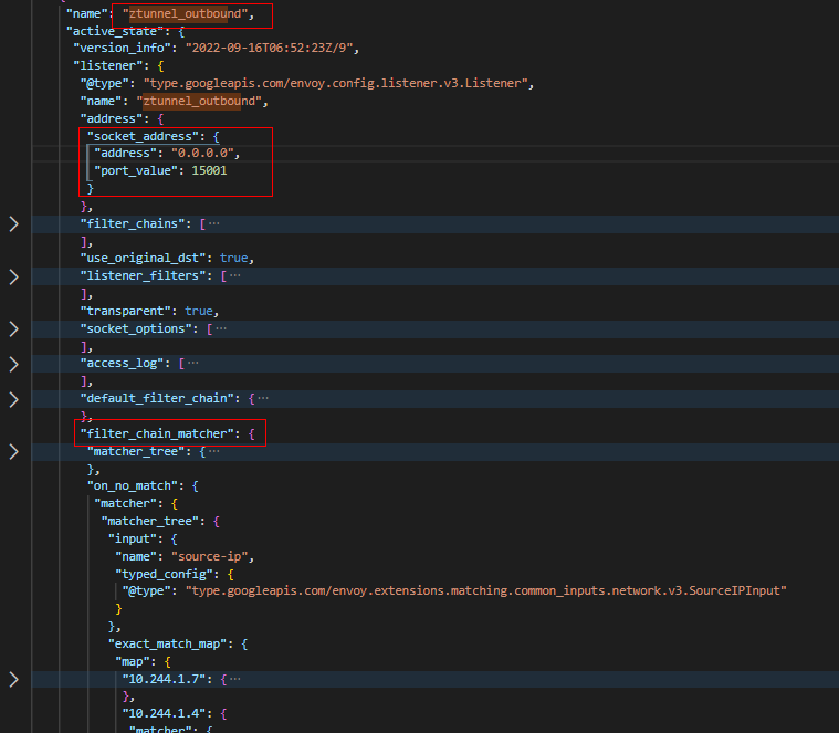 (2)ztunnel通过ztunnel_outbound监听器,监听在15001端口。ztunnel_outbound监听器与Istio Sidecar模式的监听器完全不同,它包含所有本节点上的服务到整个网格其他服务的FilterChain(过滤器链)。