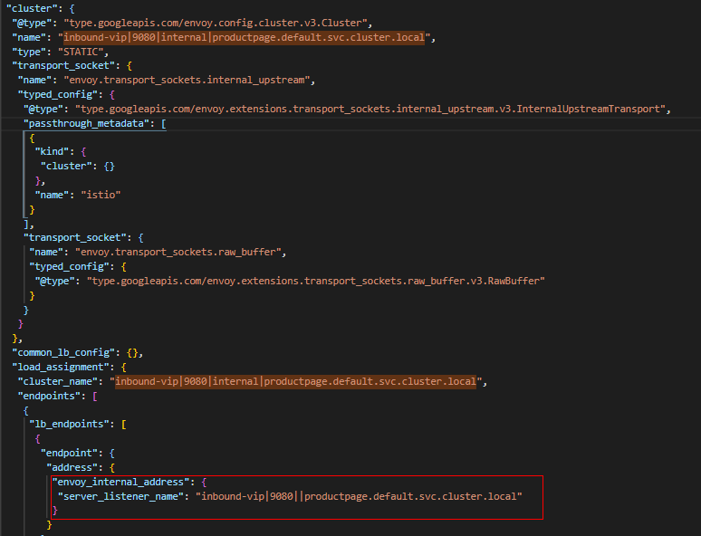 (2)”inbound-vip|9080|internal|productpage.default.svc.cluster.local” Cluster是一个内部静态类型Cluster,其主要是将流量递交给内部VIP监听器”inbound-vip|9080||productpage.default.svc.cluster.local”,不做其他额外的处理。