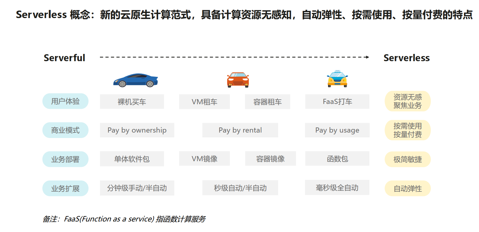 信通院也给出了定义:即以应用为中心,无需关注基础设施的计算模式。FaaS不是其唯一的形态,Serverless是一整套能力的合集,越来越多的第三方服务演进为全托管的Serverless形态。