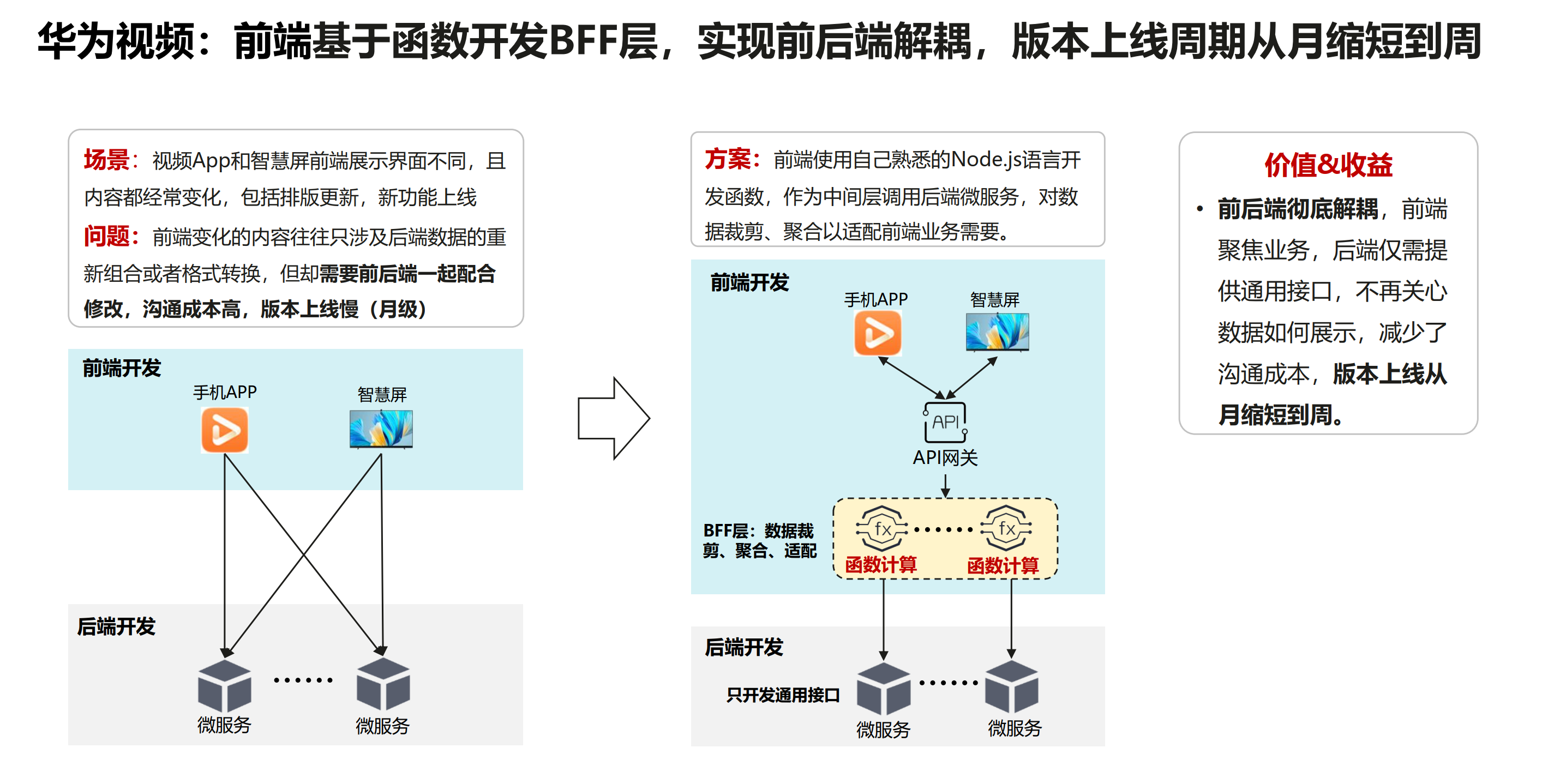华为视频作为FunctionGraph的种子用户,成功通过使用华为云FunctionGraph缩短版本上线周期。面对不同的终端,前端工程师在页面排版方面会有不同的定制化诉求,如果将数据请求的API全部交给后台来做,那么前端一旦发生变化后端的API都需要随之变化,这需要后端开发人员投入大量工作支持。使用FunctionGraph后,通过前端基于函数开发BFF层,实现前后端解耦,前端工程师有能力做全栈工作,大大提升工作效率。