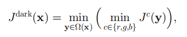 在绝大多数非天空的局部区域中,某些像素总会至少有一个颜色通道的值很低。对于一幅图像J(x),其暗通道的数学定义表示如下: