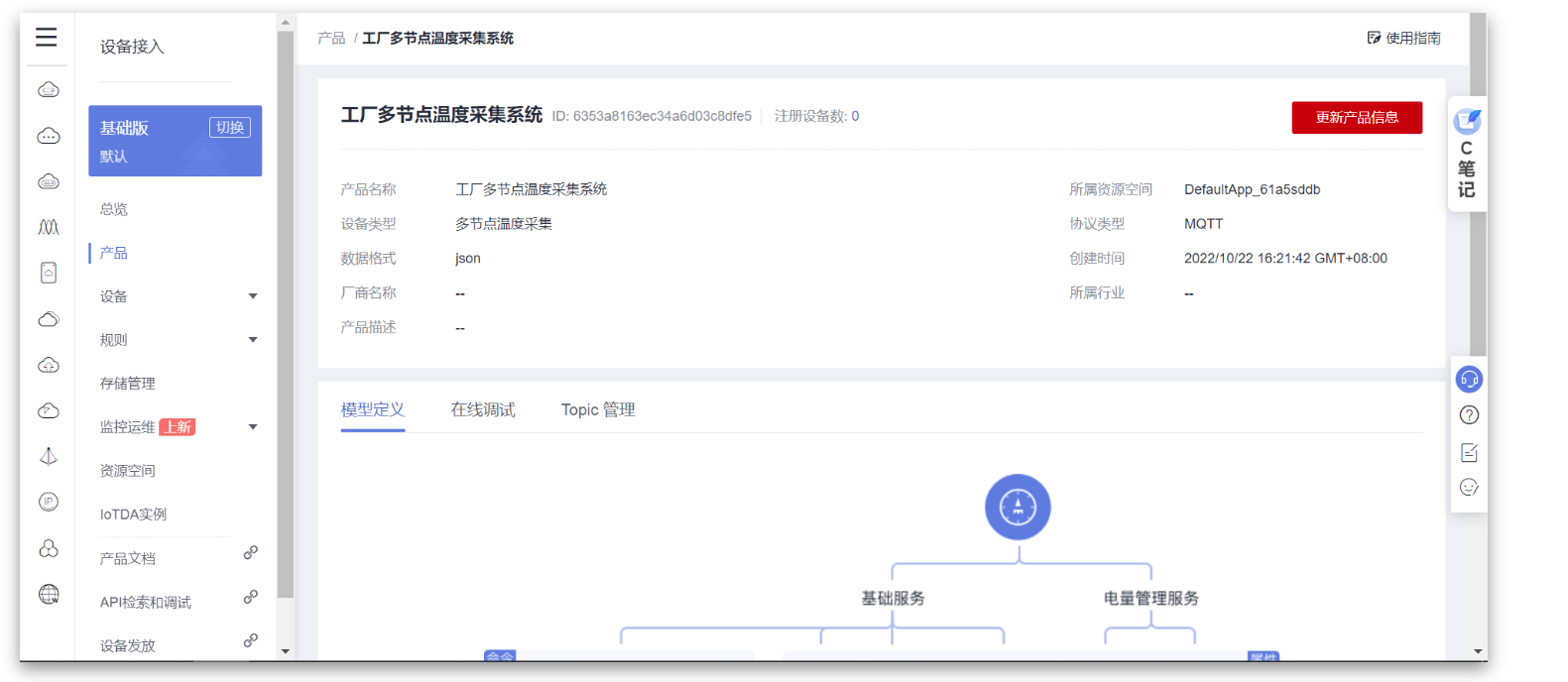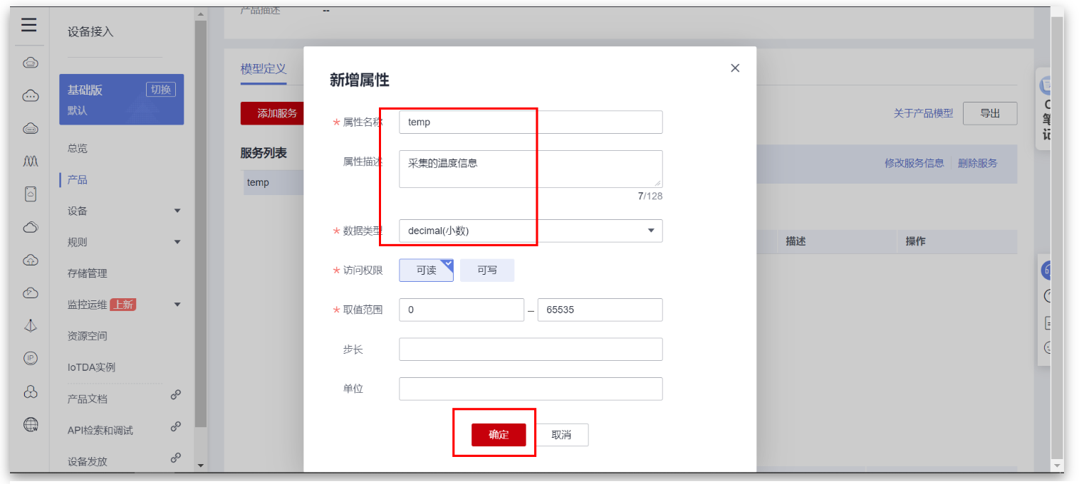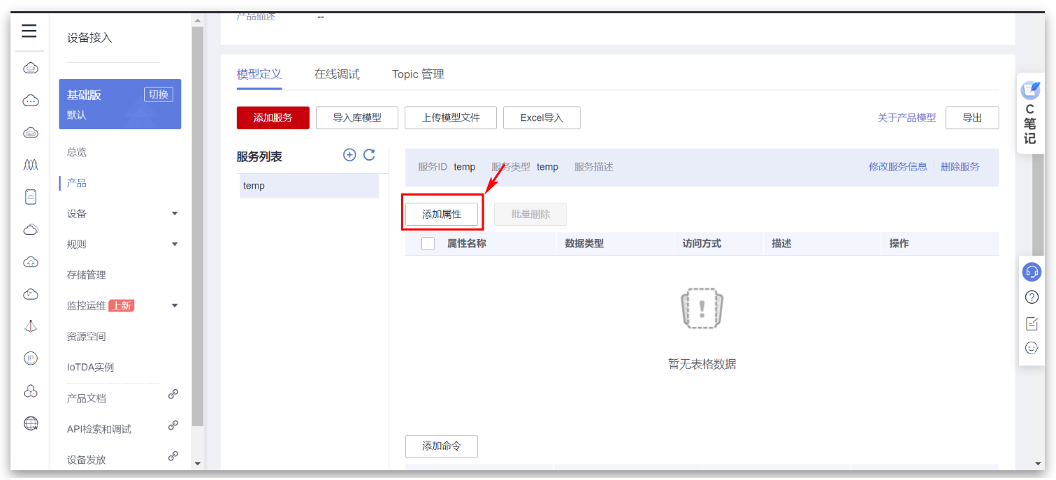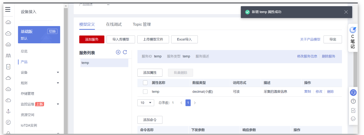 比如:温度采集设备肯定会向云平台上传采集的温度信息;在产品模型里就可以定义一个温度的属性字段。
