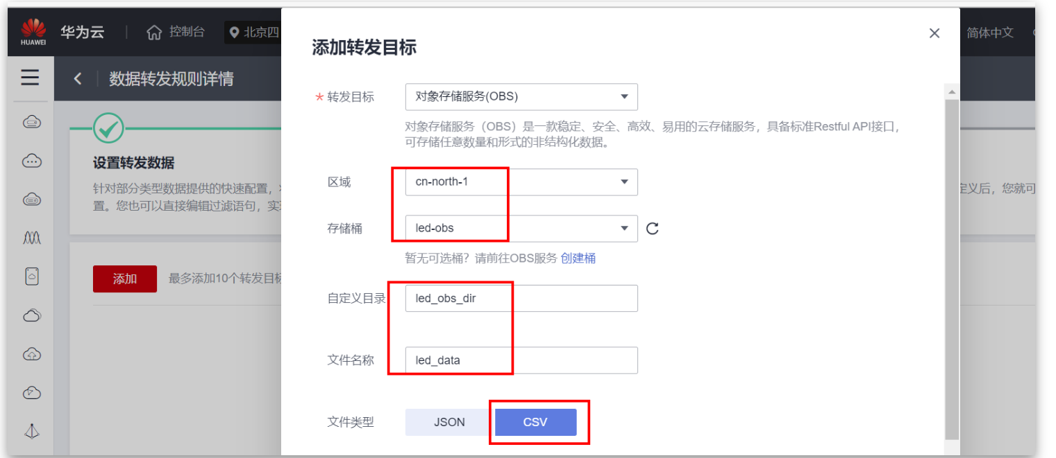 如果选择存储JSON,就是直接将设备上传的数据存放到OBS存储里,如果选择存储CSV文件,可以自己选择需要存储的字段。 下面我演示一下存储成CSV文件时如何进行设置。 (选择JSON文件不需要进行任何设置,直接将设备上传的数据JSON存储进去了)。