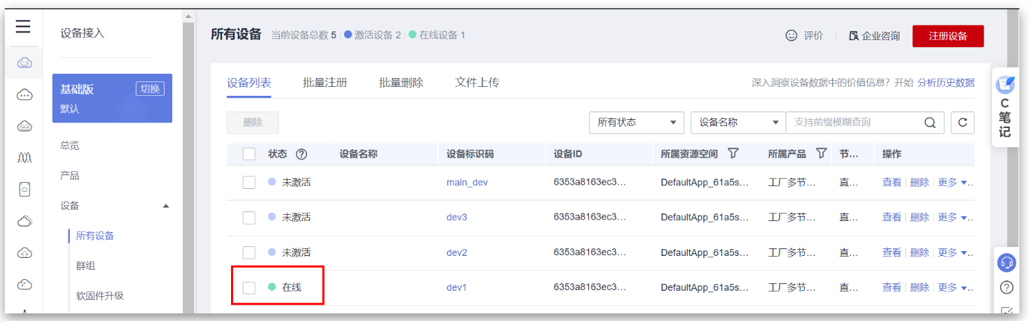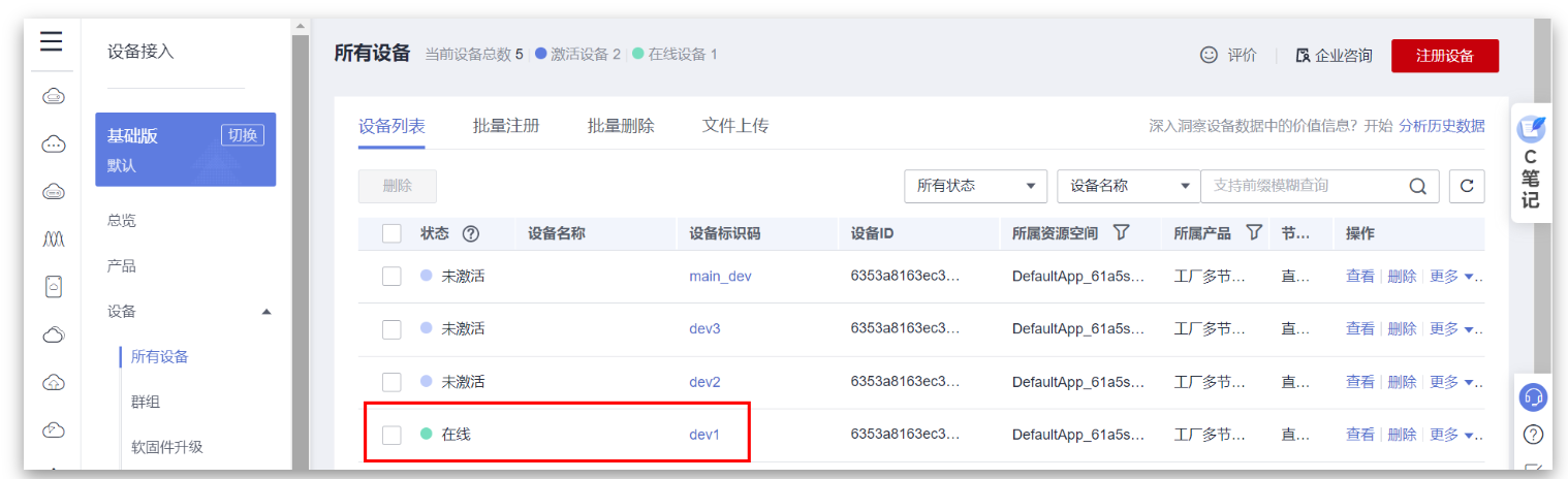 可以看到dev1已经在线了, 刚才模拟的设备就是dev1。