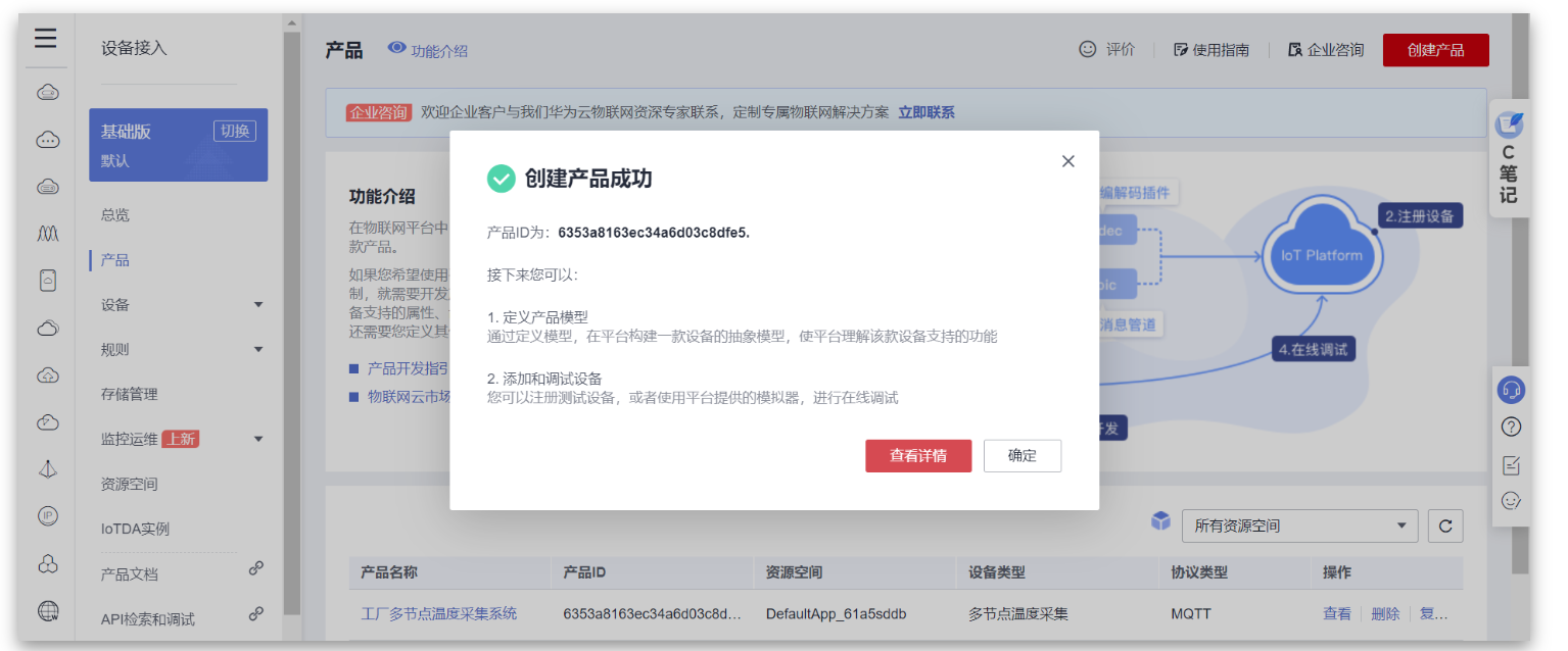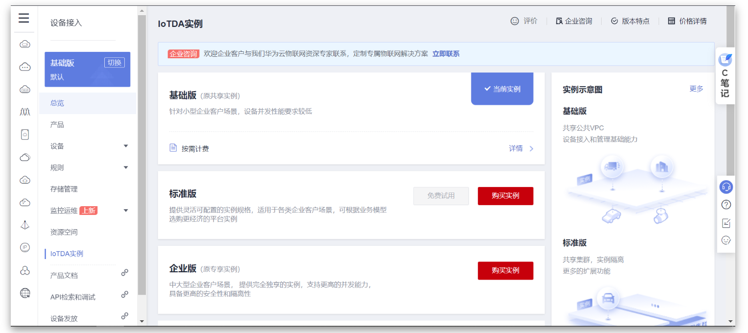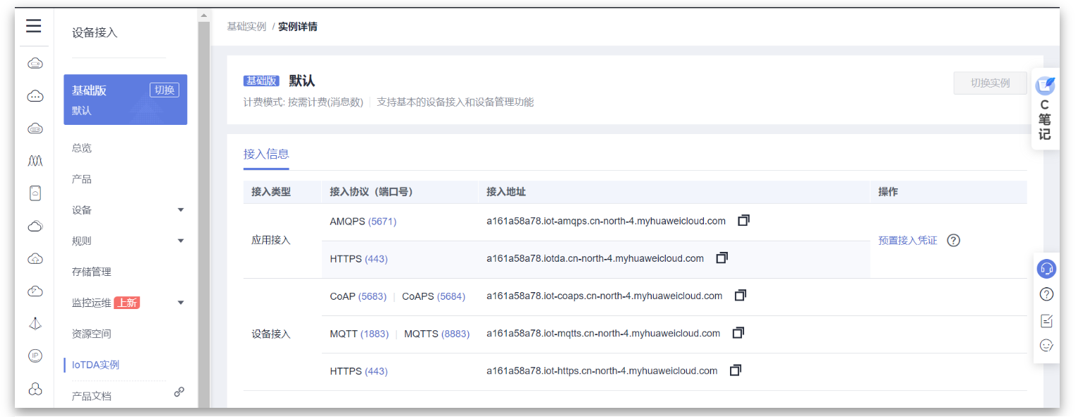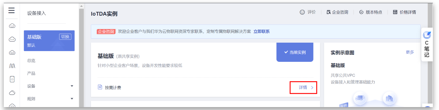 在基础版详情页面,点击右边的按需计费详情,可以查看物联网服务器接入的IP地址,端口号、接入方式。