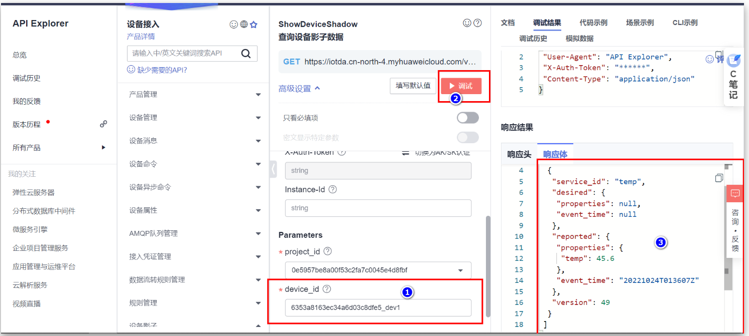 在线调试地址:https://apiexplorer.developer.huaweicloud.com/apiexplorer/debug?product=IoTDA&api=ShowDeviceShadow