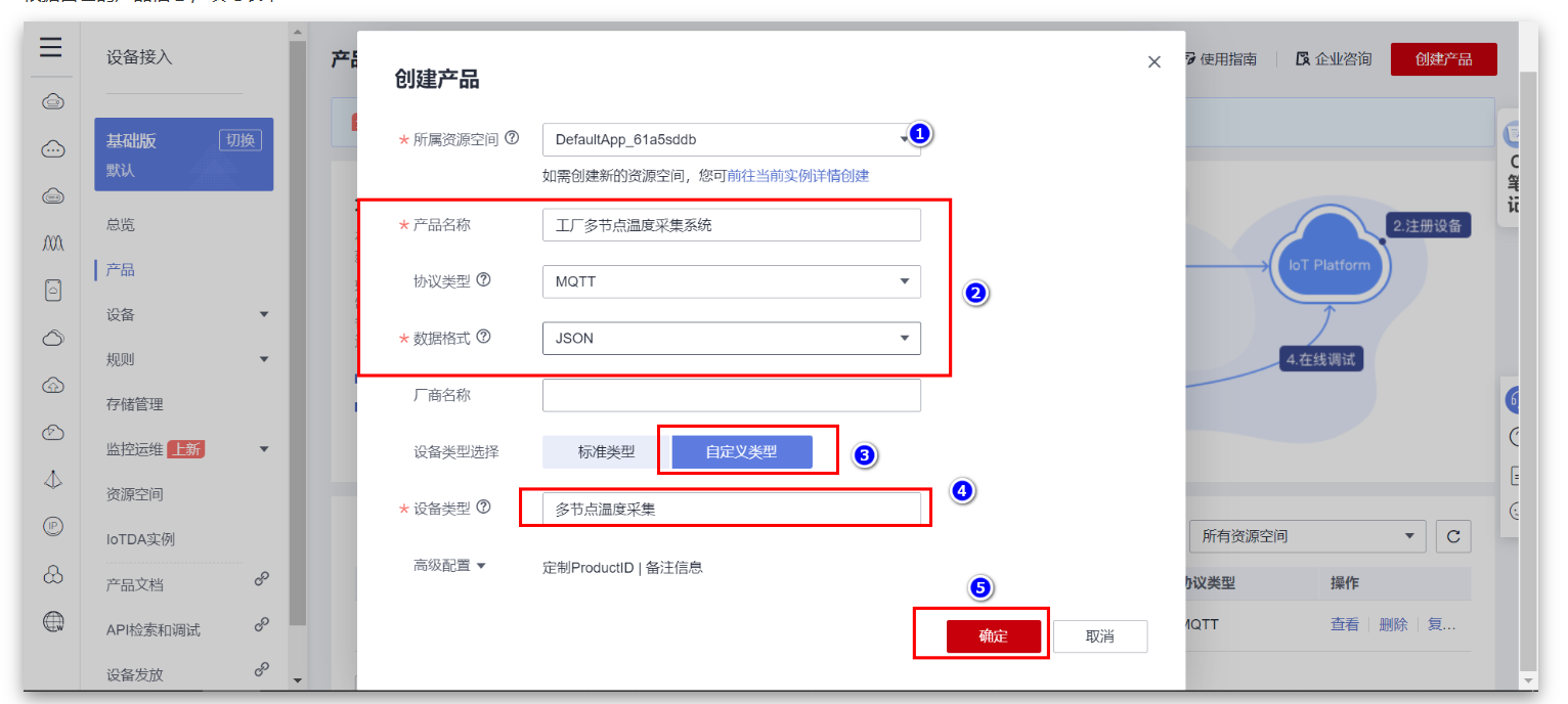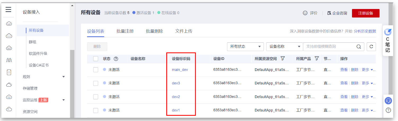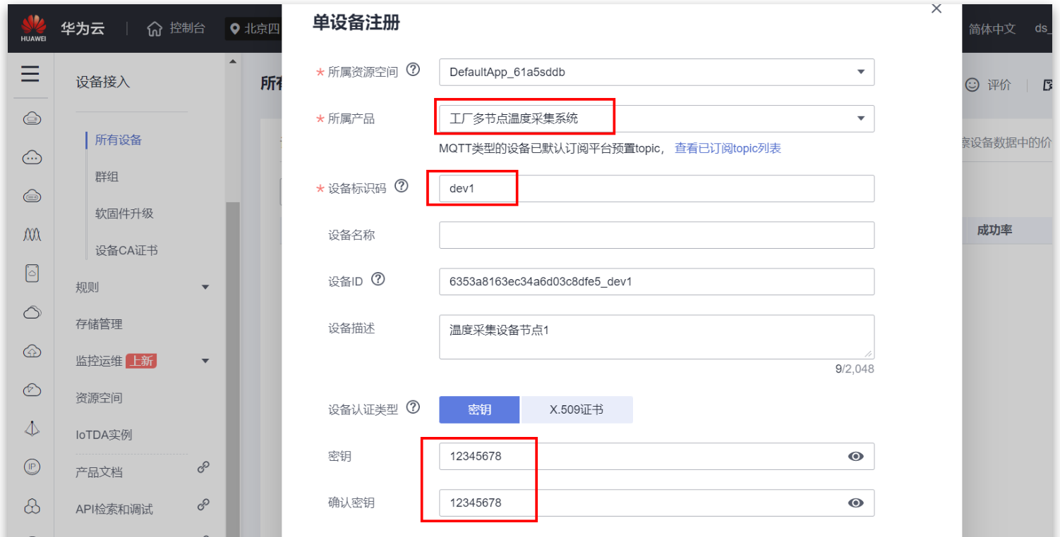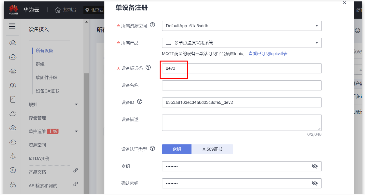 其中产品就选择刚才创建的产品,设备标识码这一项一般是填设备的ID(设备的唯一标识符,方便绑定设备)。目前还没有对接硬件,我这里就填dev1,方便接下来的测试。 下面的设备ID这一项如果不填,会自动生成,可以不管;最后输入密匙(这个密匙的作用:通过对每个设备进行身份验证,可以安全地将每个设备连接到平台,并且安全地管理这些设备),填好之后点击确定。