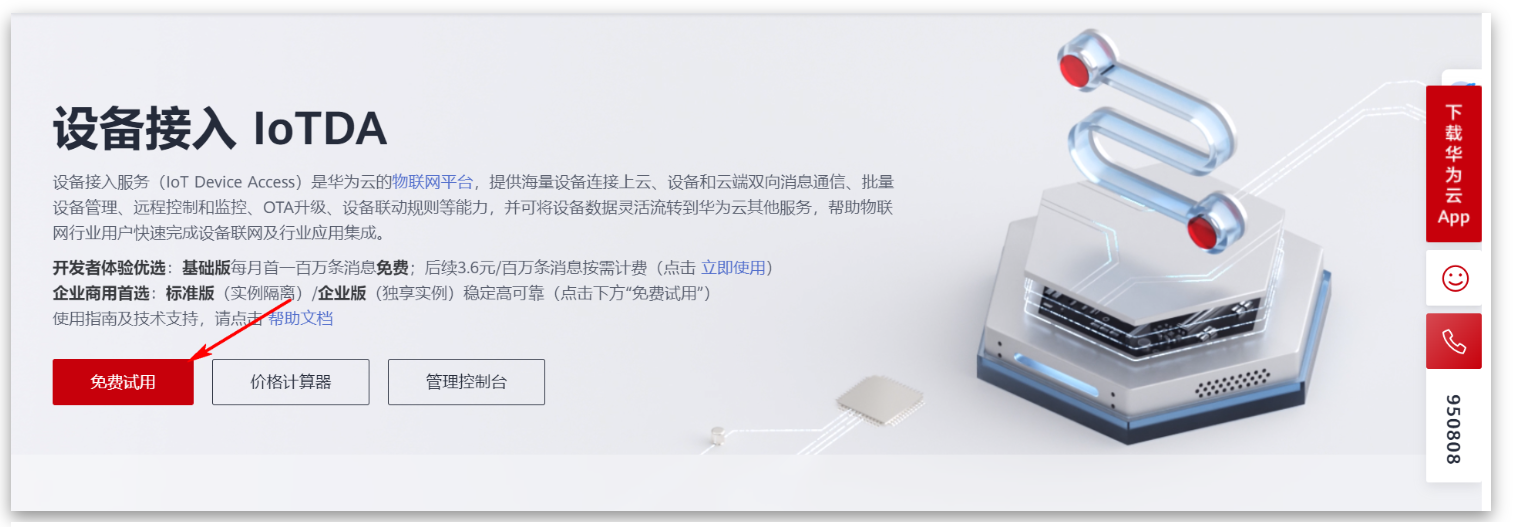 设备接入服务(IoT Device Access)是华为云的物联网平台,提供海量设备连接上云、设备和云端双向消息通信、批量设备管理、远程控制和监控、OTA升级、设备联动规则等能力,并可将设备数据灵活流转到华为云其他服务,帮助物联网行业用户快速完成设备联网及行业应用集成,基础版每月一百万条消息免费。