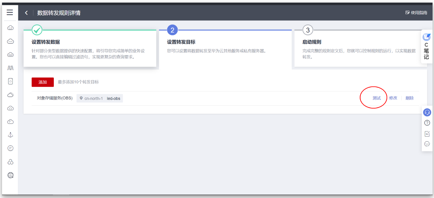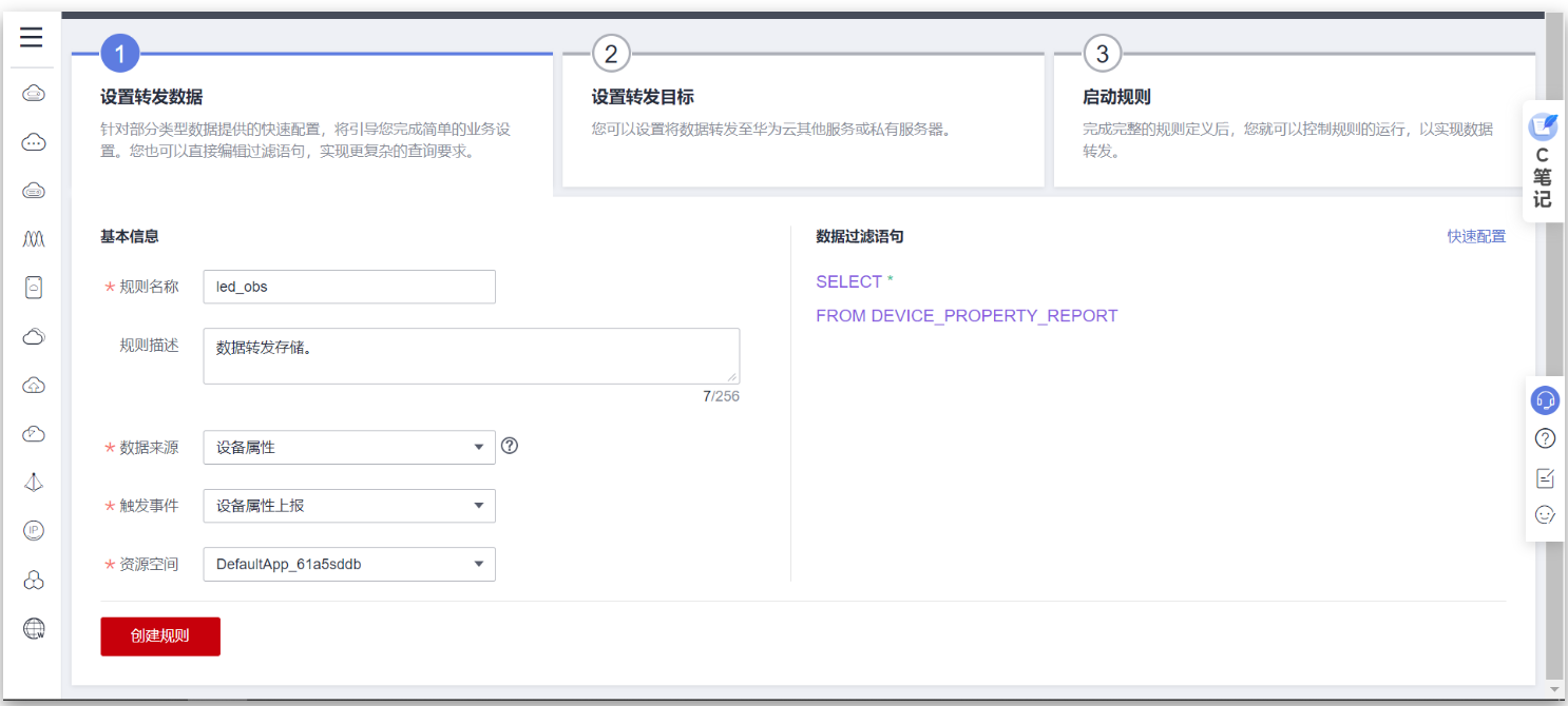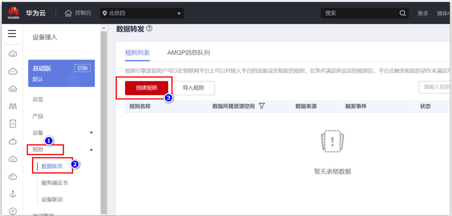 选择左侧导航栏的规则>数据转发,单击右上角的创建规则。