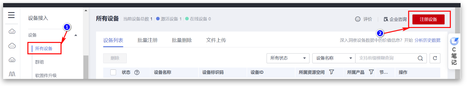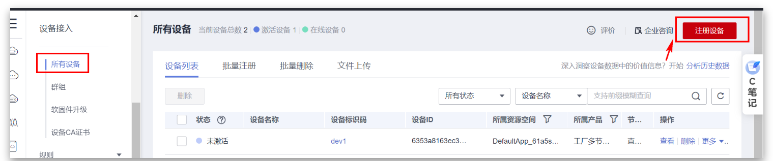 在设备页面,选择所有设备选项,点击右边的注册设备按钮。