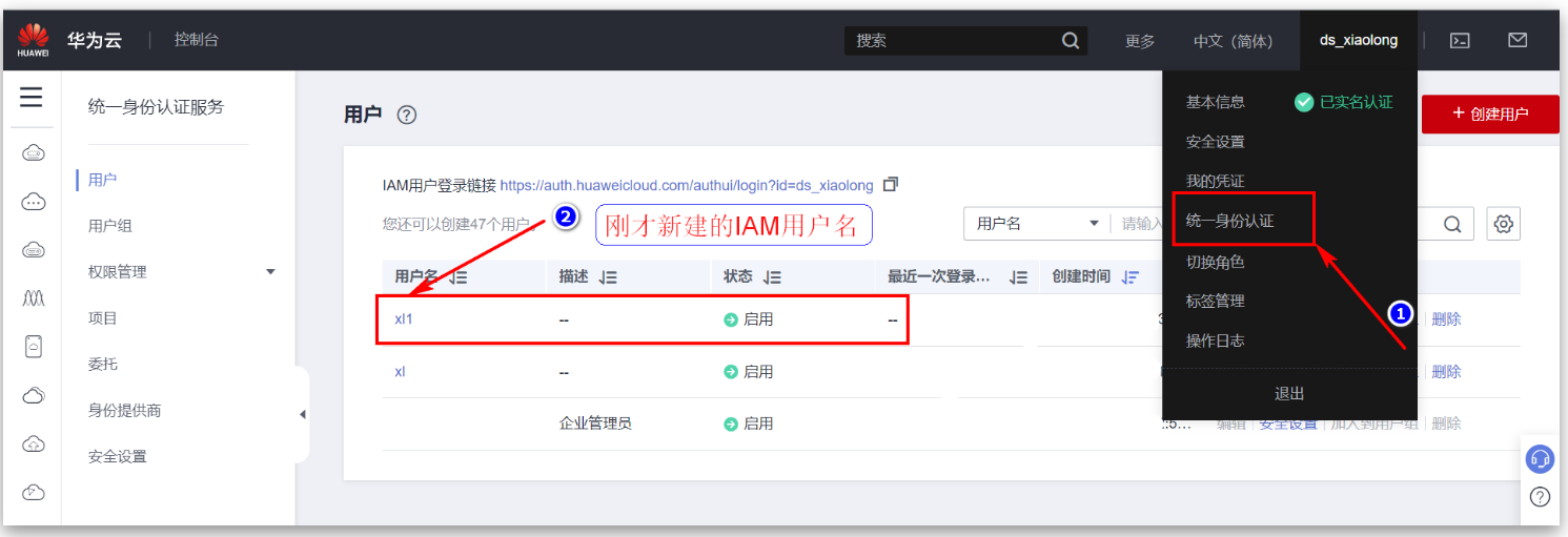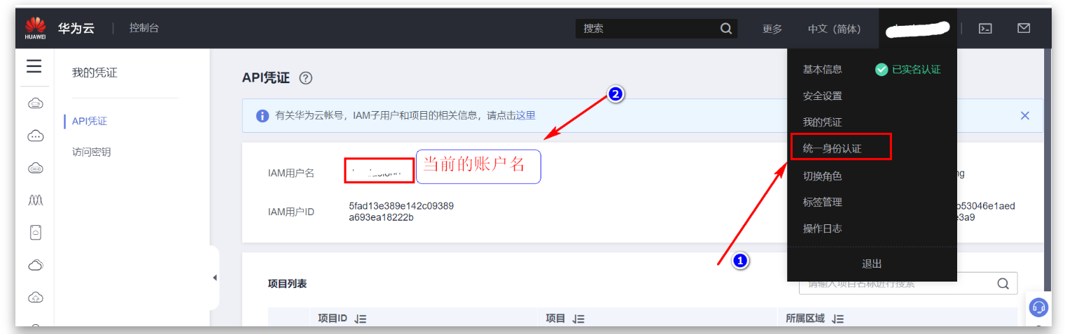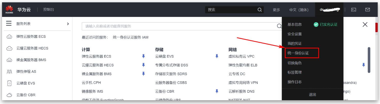 鼠标悬停在右上角的用户名称上,弹出下拉框,选择统一身份认证。