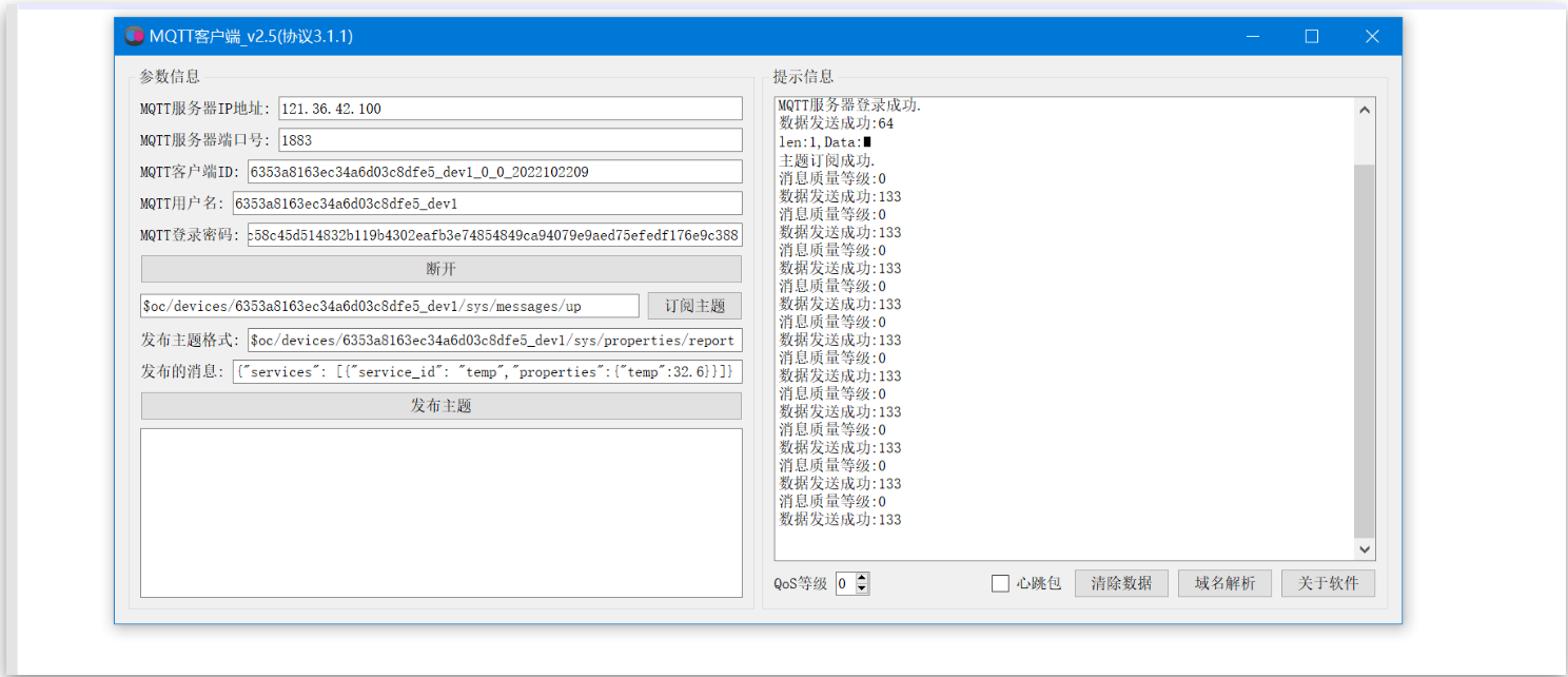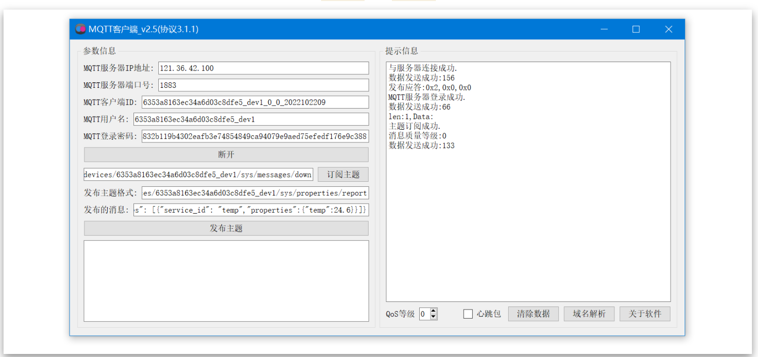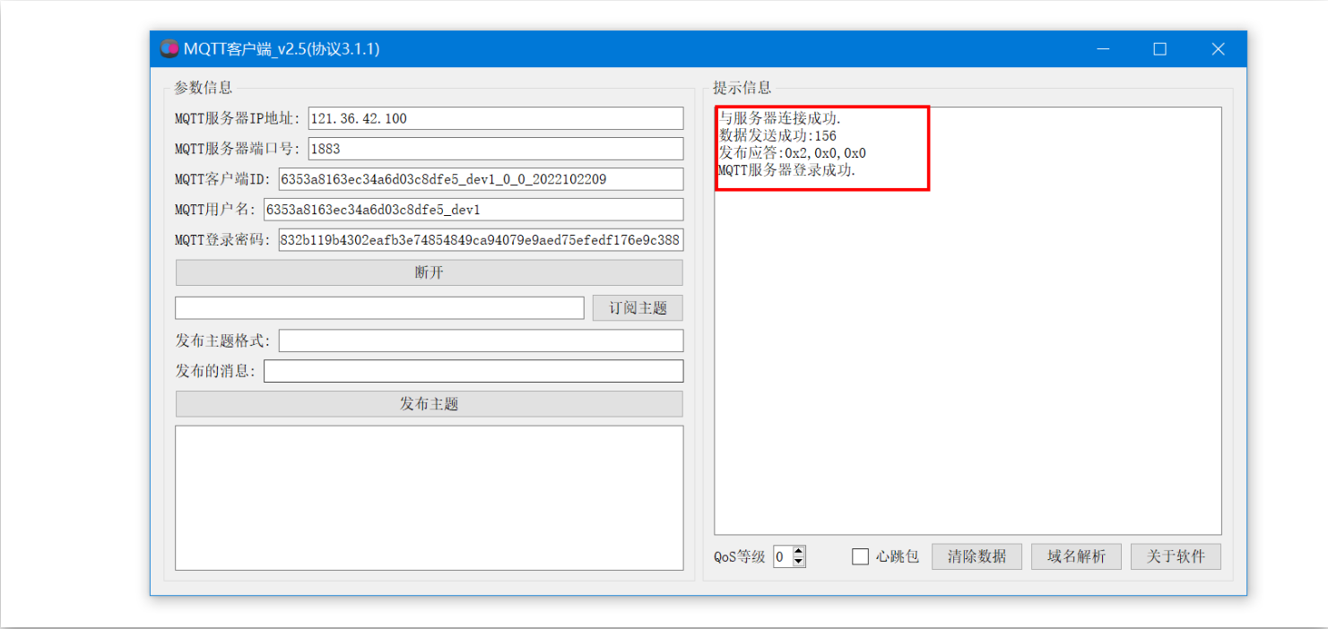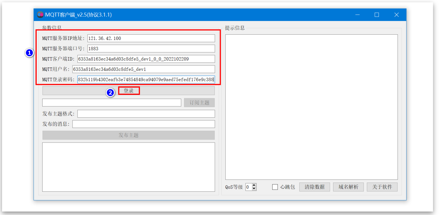 按照软件的输入框提示,输入对应的信息,点击登录。 其中的IP地址和端口号在第一小节的产品创建里就介绍过了。 后面输入的这3行就是上一步生成的MQTT鉴权三元组。