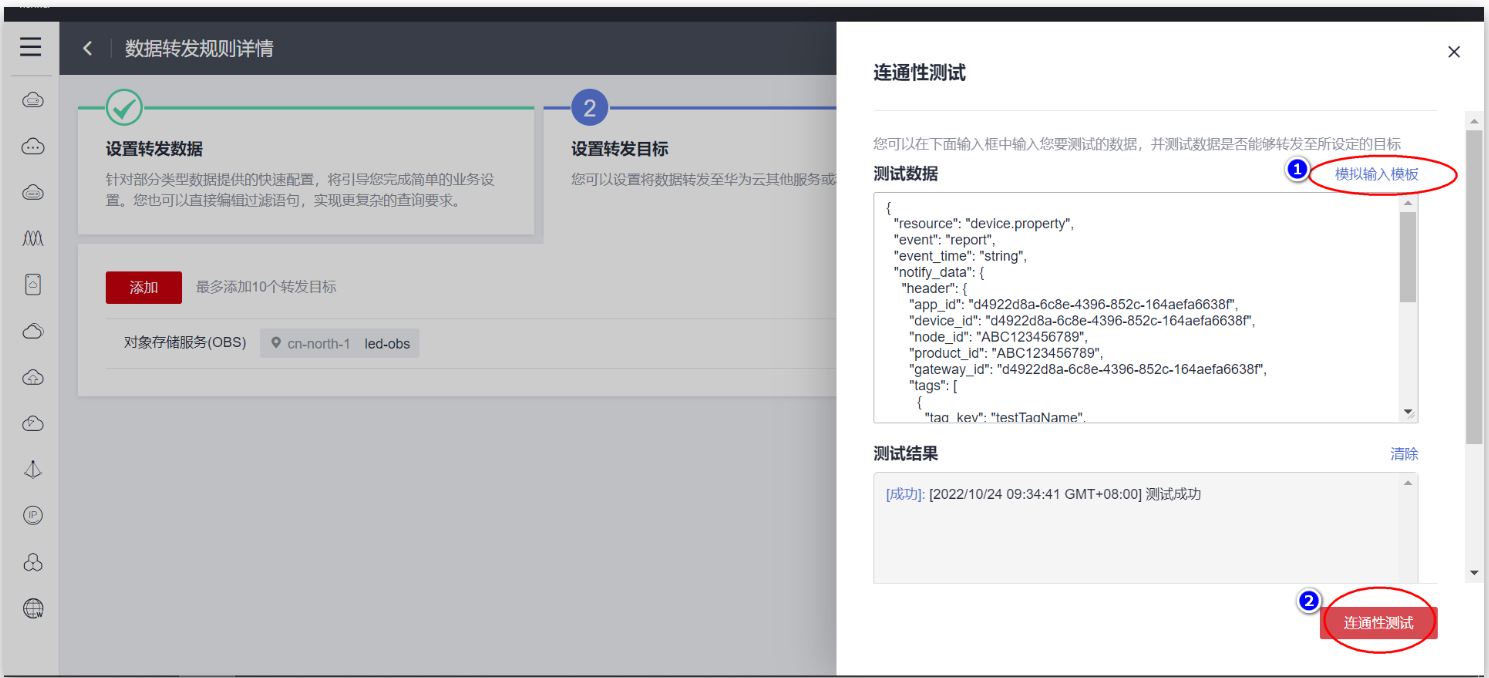 输入数据模板,然后点击连通性测试。如果测试结果显示成功,说明整体流程没有问题了。