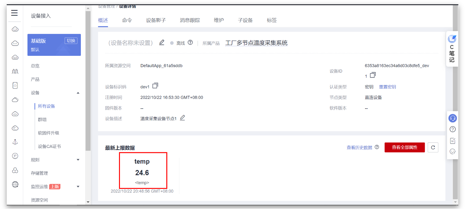 下面是调试影子 数据查询接口,查询设备影子数据: 右边返回的是设备上传的最新数据。