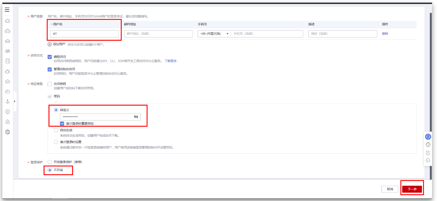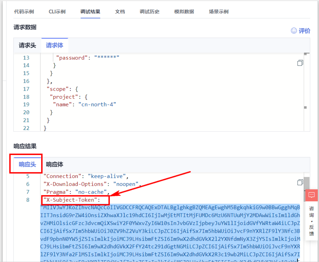 { "auth": { "identity": { "methods": [ "password" ], "password": { "user": { "domain": { "name": "xxxxx" //这里填当前主账户名称 }, "name": "xxxx", //这个新建的子账户名称 "password": "xxxxx" //这个是新建的子账户密码 } } }, "scope": { "project": { "name": "cn-north-4" } } } }