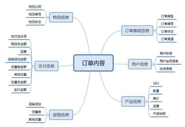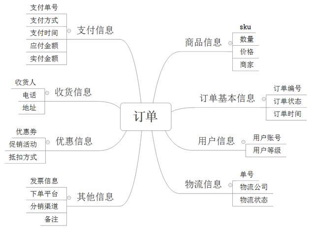 以一个通用B2C商城的订单为例,梳理其包含的信息如下: