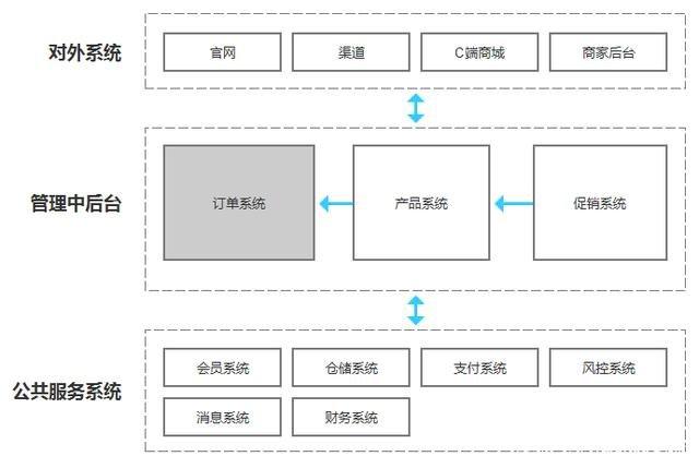 每个C端的业务形态都会有一个对应的系统模块,如负责管理平台交易的订单系统,管理优惠信息的促销系统,管理平台所有产品的产品系统,以及管理所有对外系统显示内容的内容系统等。
