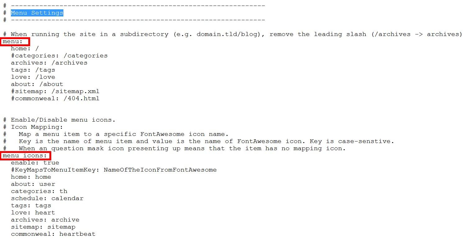 默认的侧栏菜单条目有:首页、归档、标签、关于、搜索等。如果你想要增加其他的菜单条目,修改主题配置文件_config.yml里的Menu Settings中的menu和menu_icons两个地方
