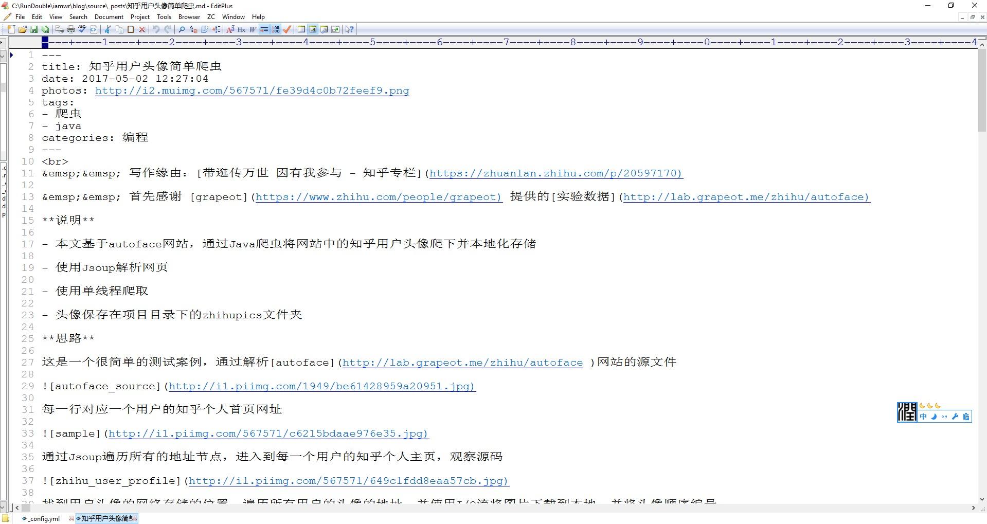 我们会发现在blog根目录下的source文件夹中的_post文件夹中多了一个 博客名字.md 文件,使用Markdown编辑器打开,就可以开始你的个人博客之旅了,Markdown常用的样式也就十来种,完全能够满足一般博文的样式要求,这是我的一篇博文内容示例: