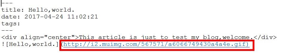 图床,当博文中有图片时,若是少量图片,可以直接把图片存放在source文件夹中,但这显然不合理的,因为图片会占据大量的存储的空间,加载的时候相对缓慢 ,这时考虑把博文里的图片上传到某一网站,然后获得外部链接,使用Markdown语法, 完成图片的插入,这种网站就被成为图床。常见的简易的图床网站有:贴图库图片外链 国内算比较好的图床我认为有两个:新浪微博和 七牛云 ,七牛云的使用方法可以参看其他文章。图床最重要的就是稳定速度快,所以在挑选图床的时候一定要仔细,下图是博文插入图片,使用图床外链的示例: