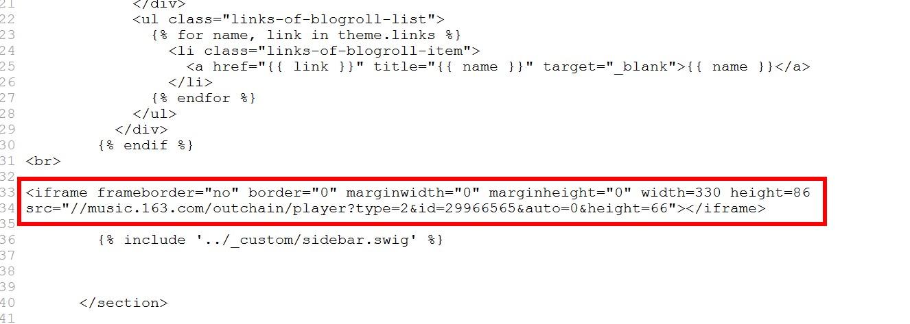 比如在侧栏插入这首歌的音乐播放器,修改 blog\themes\next\layout\_macro的sidebar.swig文件,添加刚刚复制的外链代码