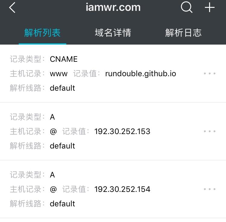 包括添加三条解析记录,192.30.252.153是GitHub的地址,你也可以ping你的 http://xxxx.github.io 的ip地址,填入进去。第三个记录类型是CNAME,CNAME的记录值是:你的用户名.http://github.io 这里千万别弄错了。第二步,登录GitHub,进入之前创建的仓库,点击settings,设置Custom domain,输入你的域名