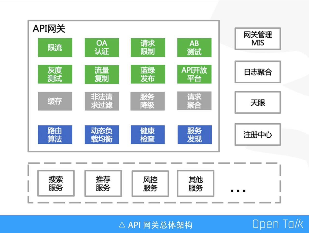上图下侧是 API 网关代理的服务,如搜索、推荐、风控、流量分发等等。