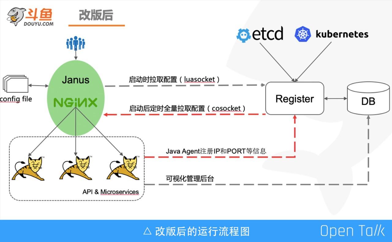但是只有这个不能解决所有问题,比如服务的性能监控、系统的资源调度等问题,还需要其他基础设施来支撑。所以 Docker 和 Kubernetes 进入了我们的视野。由于本次活动主题是 OpenResty,对容器技术选型就不做展开了。服务上容器,在更新和迁移中 IP 和 Port 是变化的、不确定的,这是必须要解决的问题。