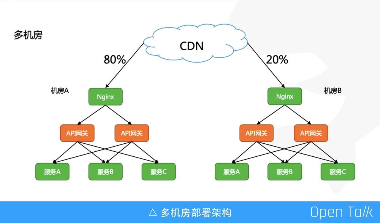 这是多机房部署架构,上游使用 CDN 来做流量分配,方便机房故障时进行一键流量切换。
