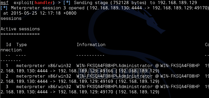 (2) 目标主机执行程序后,在kali终端中的检测程序会及时检测到。在检测到目标主机运行程序后,后门程序会反向连接到msf,之后msf发起第二次攻击(开始渗透),然后客户端(后门程序)连接到服务端(msf)。输入sessionss: