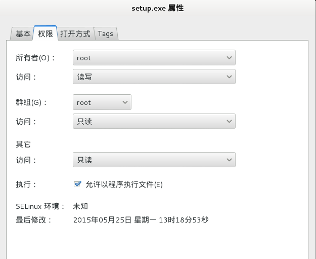 (3) 进入setup.exe所在目录,修改属性:选择“允许以程序执行文件”。
