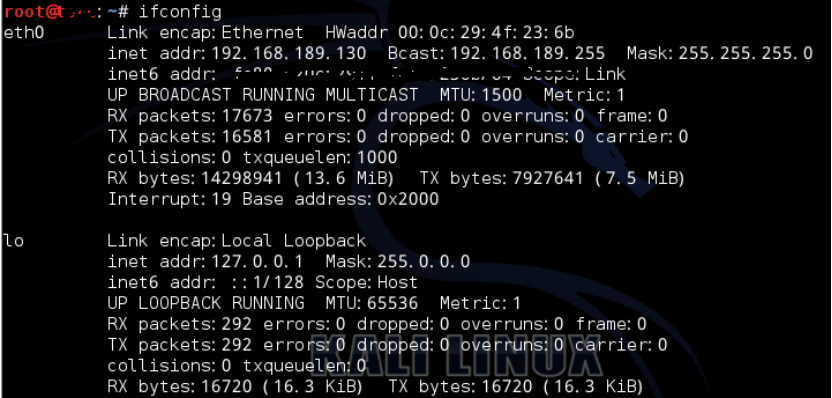 (1) 打开kali终端,输入ifconfig, 得到本机ip为192.168.189.130。