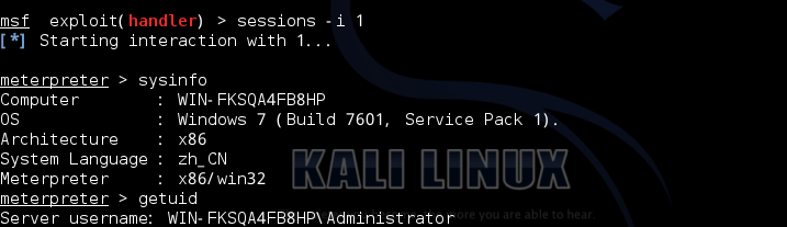 (2)再继续输入sessions -i 1,之后可以对目标主机进行一系列的操作。如输入sysinfo可知道目标主机的系统信息;输入 getuid查看对方正在运行的用户。